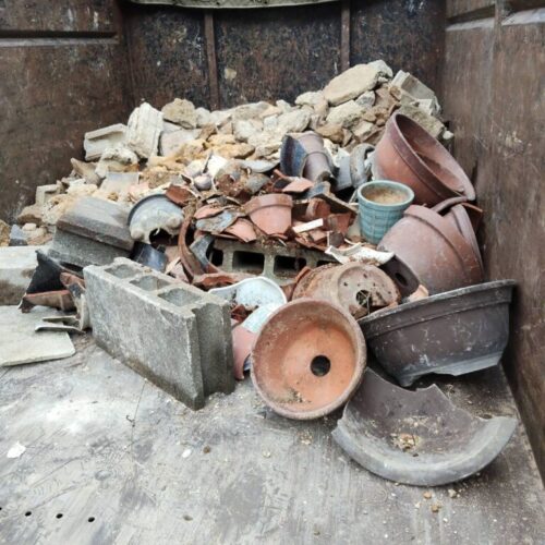 当日は雨が降っており、足元が滑りやすい中での作業となりました。そのため、予想以上に時間がかかりましたが、庭や周辺を汚さないようシートを使いながら慎重に進めました。スタッフ2名が連携して、すべての瓦礫や植木鉢を回収し、庭をきれいに整えました❗️